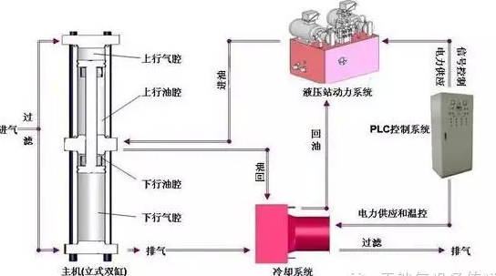 氣缸,油缸雙缸一體化的設(shè)計,油液在流動中帶走熱量,解決了部分氣缸散熱難題。結(jié)構(gòu)緊湊,縮短了軸向尺寸,可立式安裝,減少占地面積,無偏磨