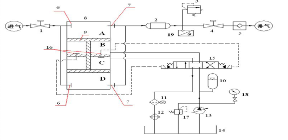 工字形活塞桿將上面氣缸分隔為 A、B 兩個腔,將下面氣缸分隔為 C、D 兩個腔,液壓站輸出的高壓油進(jìn)入 C 腔, B 腔的油回油箱(近似認(rèn)為回油箱的油壓力為0),活塞桿向下運動,槽車內(nèi)氣體進(jìn)入 A 腔(一級進(jìn)氣),而 D 腔的氣體則經(jīng)壓縮后流出(一級壓縮),進(jìn)入冷卻器,完成一級壓縮過程;當(dāng)活塞運行到極點時,液壓站換向閥將會換向,輸出的高壓油進(jìn)入 B 腔, C 腔的油回油箱,活塞桿向上運動,槽車內(nèi)氣體進(jìn)入 D 腔(一級進(jìn)氣),而 A 腔的氣體則經(jīng)壓縮后流出(一級壓縮),進(jìn)入冷卻器,完成一級壓縮過程。