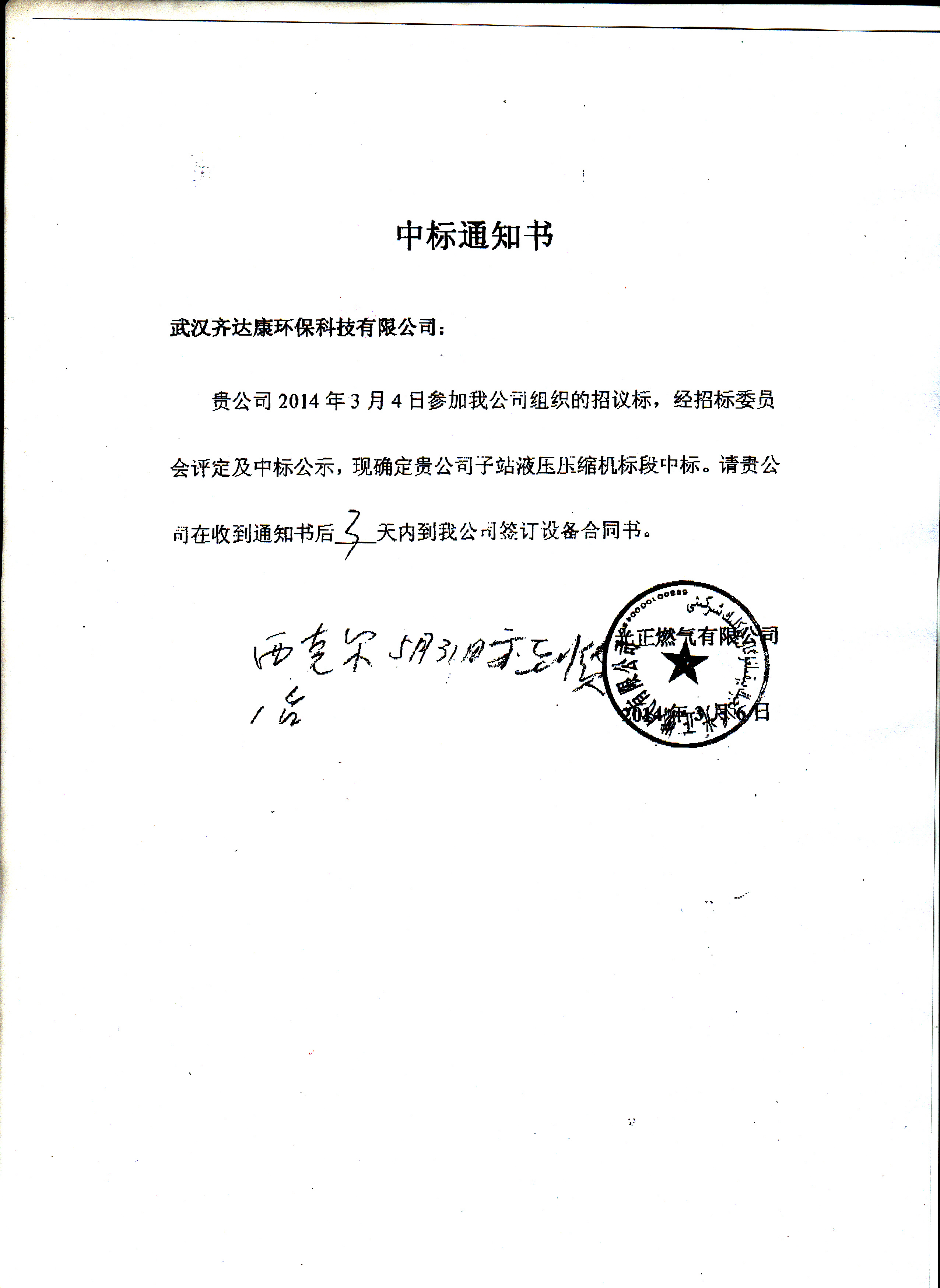 熱烈祝賀齊達(dá)康中標(biāo)光正燃?xì)?/p>