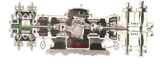 傳統(tǒng)機(jī)械式子站壓縮機(jī)是最早一代的加氣站壓縮機(jī)其傳動模式是:電機(jī)帶動曲軸旋轉(zhuǎn),通過連桿、十字頭、活塞桿,帶動活塞在氣缸內(nèi)作往復(fù)運(yùn)動,實(shí)現(xiàn)氣體的壓縮過程,實(shí)現(xiàn)增壓目的。如下圖: