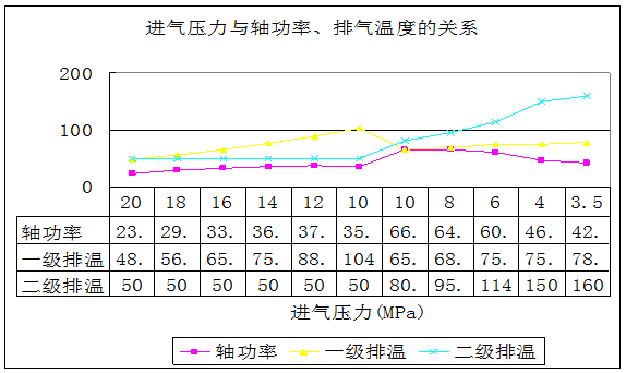 (4)能耗較大。選用電機(jī)功率較大(75kW或90kW),啟動電流也大。因此不能頻繁啟動。下圖是槽車壓力與軸功率和排氣溫度曲線。從圖線可以看出,槽車壓力在10MPa時(shí),功率最大,其它壓力段的無功損耗較多,并且,為了保證電機(jī)在空負(fù)荷下啟動,在停機(jī)時(shí)要將氣缸及管線內(nèi)的氣體放空。