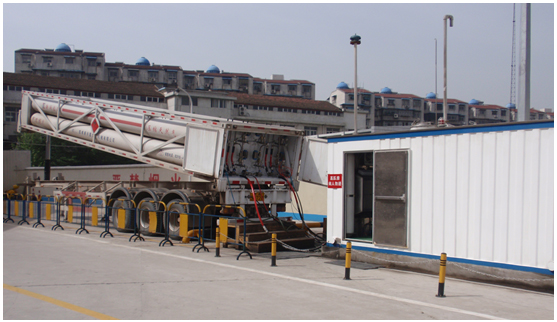 (2)簡化加氣站流程。加氣站設(shè)備只需槽車和液壓工作撬系統(tǒng)、售氣機即可。占地面積小。單線加氣。由于沒有儲氣設(shè)備,不能多線加氣。